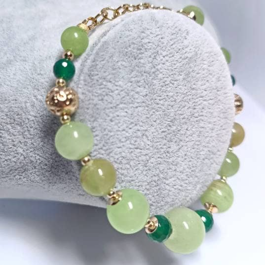 Круглые бусин зеленого оникса с проявляющимися внутренними рисунками желтого, коричневатого, белого или светло-бежевого оттенков чем-то напоминают планету Юпитер.