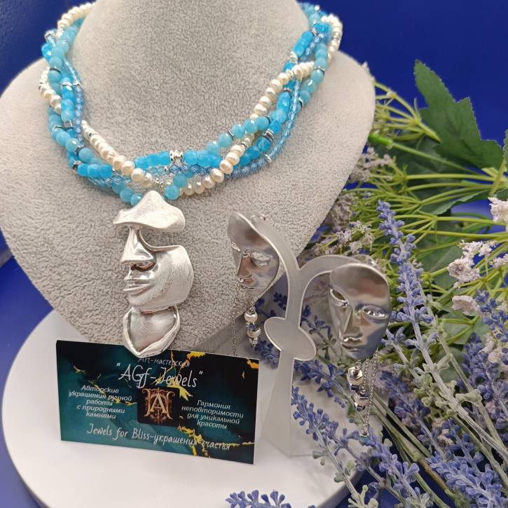 Колье "Лик притяжения" из белого жемчуга,голубого кварца и голубого циркона от "AGf-Jewels" (Jewels for Bliss - украшения счастья)